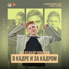 ![]() 19 марта 2026 года в 16:45 в коворкинге факультета (Г-302) в рамках Киноклуба РиСО состоится встреча с молодым актёром кино и сериалов Александром Новиковым. |