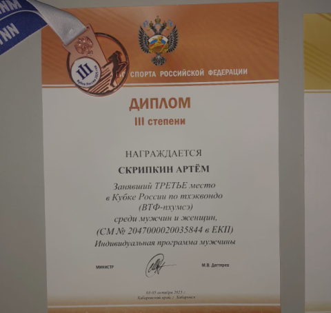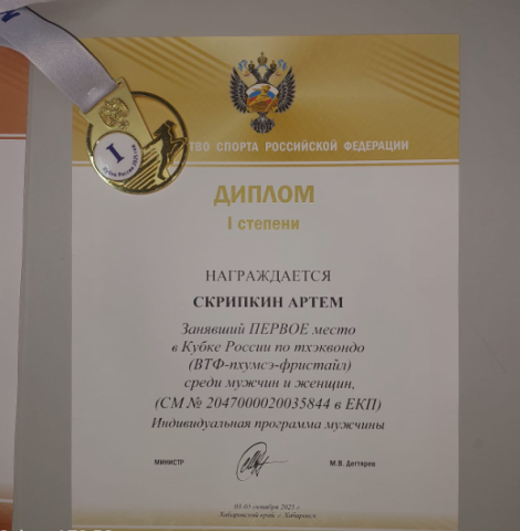 Студент 2 курса 204б группы Скрипкин Артём Денисович занял первое место в Кубке России по тхэквондо ( ВТФ- пхумсэ-фристайл) и третье место по тхэквондо (ВТФ- пхумсэ).