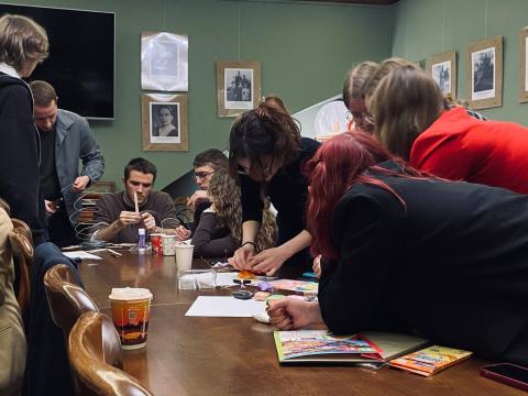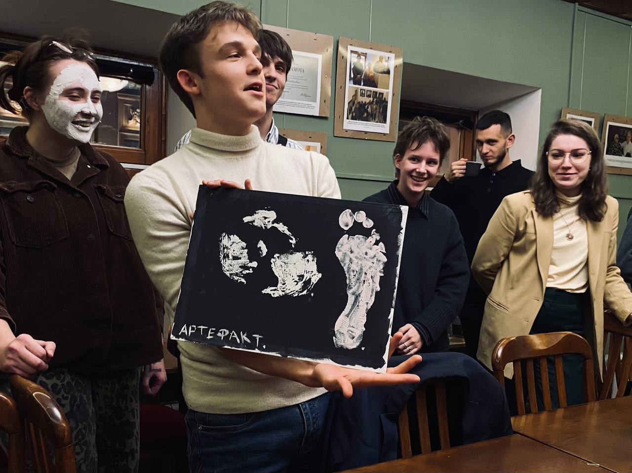 Лекционную часть сменил интерактивный мастер-класс «Упражнения в современном искусстве», специально подготовленный сотрудниками Дома-музея. Участники, объединившись в группы, создавали произведения искусства из предложенных материалов, а затем представляли их концептуальное обоснование, на практике демонстрируя связь между философией и художественным творчеством.