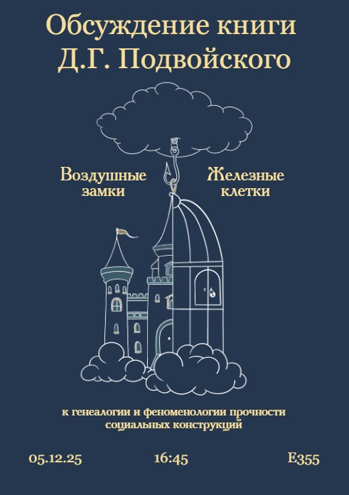 Научный семинар кафедры социальной философии и философии истории будет посвящён обсуждению новой книги доцента Дениса Глебовича Подвойского «Воздушные замки / Железные клетки: к генеалогии и феноменологии прочности социальных конструкций». Денис Глебович представит новую книгу, после чего все желающие смогут задать автору произведения все интересующие вопросы.