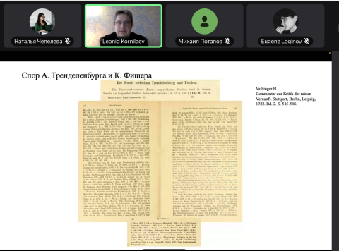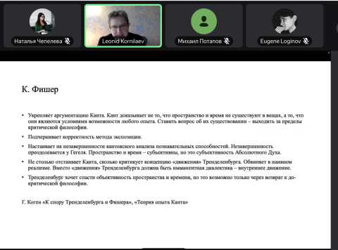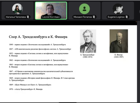 С докладом «А. Тренделенбург и К. Фишер о пространстве и времени в философии И. Канта» выступил доцент кафедры философии гуманитарных факультетов к.ф.н. Леонид Юрьевич Корнилаев.