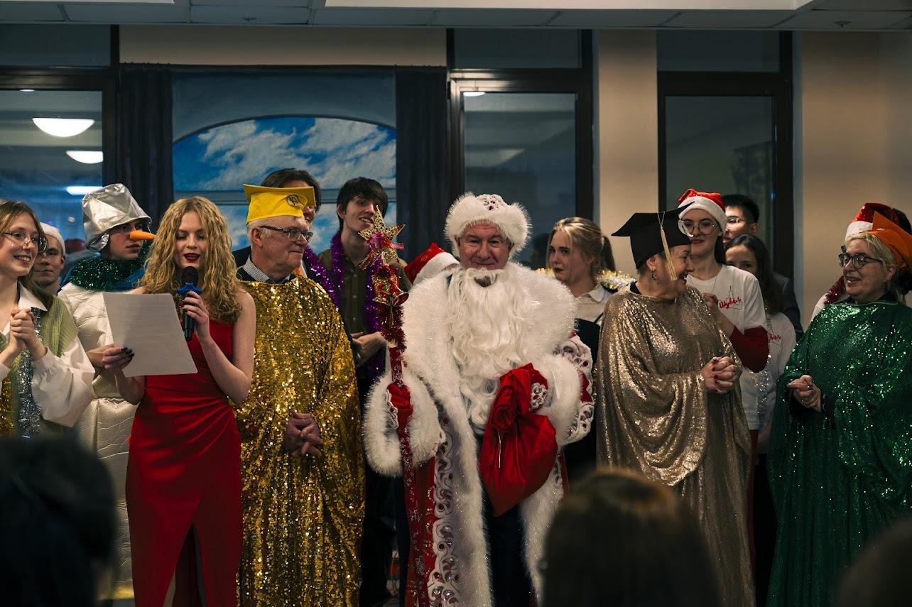 В этом году студенты и преподаватели отправились в университет Праздников на факультет Нового года, чтобы вместе научиться отмечать это волшебное событие. На сцене выступали студенты: Каряева Анастасия, Селяева Александра, Штанина Вероника, Каримова Камилла, Ванюков Иван, Вревский Геогрий, Семенов Альфонсо Артуро, Хаобо Лю, Попова Елизавета, Пономарева Вивиана.