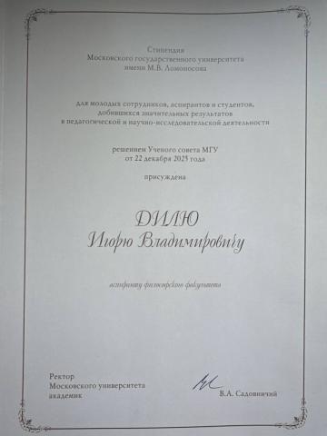23 января 2026 года в Актовом зале Главного здания МГУ состоялось торжественное заседание, посвящённое 271-й годовщине основания Московского университета. В рамках мероприятия состоялось вручение дипломов стипендиатам МГУ — молодым сотрудникам, аспирантам и студентам, добившимся значительных результатов в педагогической и научно-исследовательской деятельности.