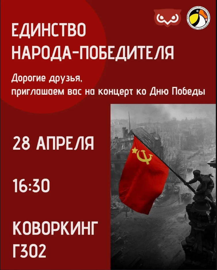 28 апреля 2026 года в 16:30 в аудитории Г-302 (коворкинг) состоится концерт «Единство народа-победителя», посвященный 81-й годовщине Победы в Великой Отечественной войне.